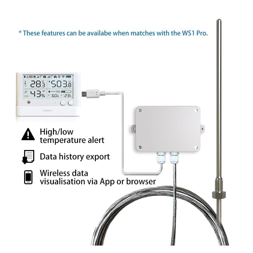 UbiBot Sonda Zewnętrzna PT100 (-200°C … +400°C). Stal nierdzewna 304, RS485 Modbus. Niezawodny pomiar temperatury w warunkach przemysłowych i ekstremalnych. Kompatybilna z rejestratorem WS1 Pro.