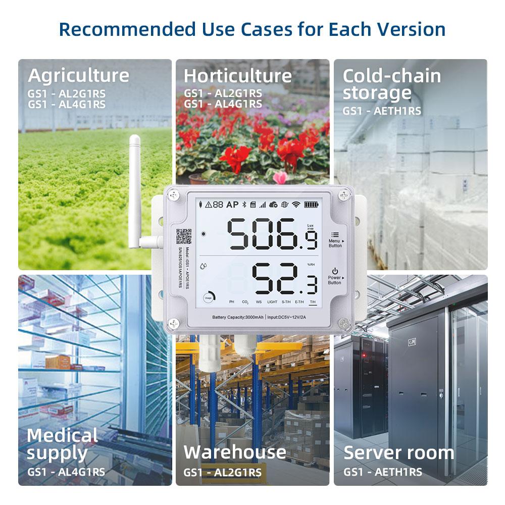 Dzięki solidnej obudowie IP65 model GS1-A1RS jest szczególnie polecany do monitoringu warunków w szklarniach, magazynach zewnętrznych, chłodniach, pomieszczeniach o podwyższonej wilgotności, serwerowniach oraz w aplikacjach przemysłowych. Możliwość rozbudowy o sondy zewnętrzne sprawia, że urządzenie jest bardzo wszechstronne.