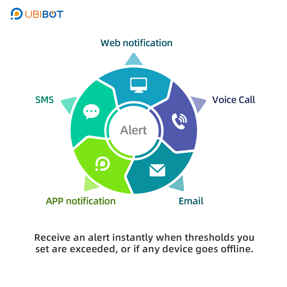 Dzięki aplikacji UbiBot możesz skonfigurować powiadomienia w czasie rzeczywistym. Gdy wartości przekroczą ustalone progi, otrzymasz alert poprzez: