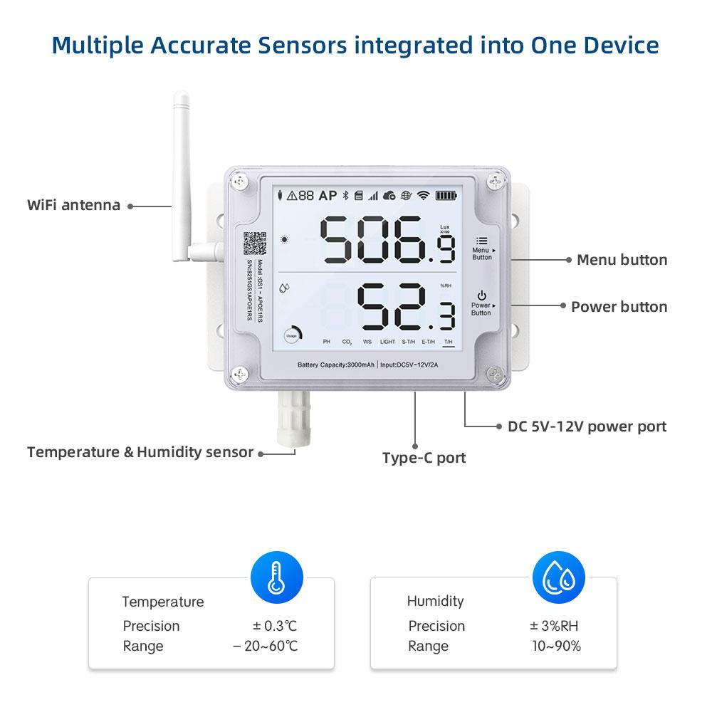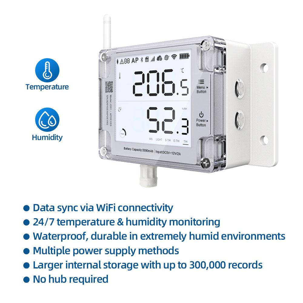 UbiBot GS1-A1RS – rejestrator temperatury i wilgotności WiFi z obudową IP65 i wyświetlaczem 4". Akumulator 2900 mAh, RS485, pamięć 300 000 rekordów. Zdalny monitoring i alerty.