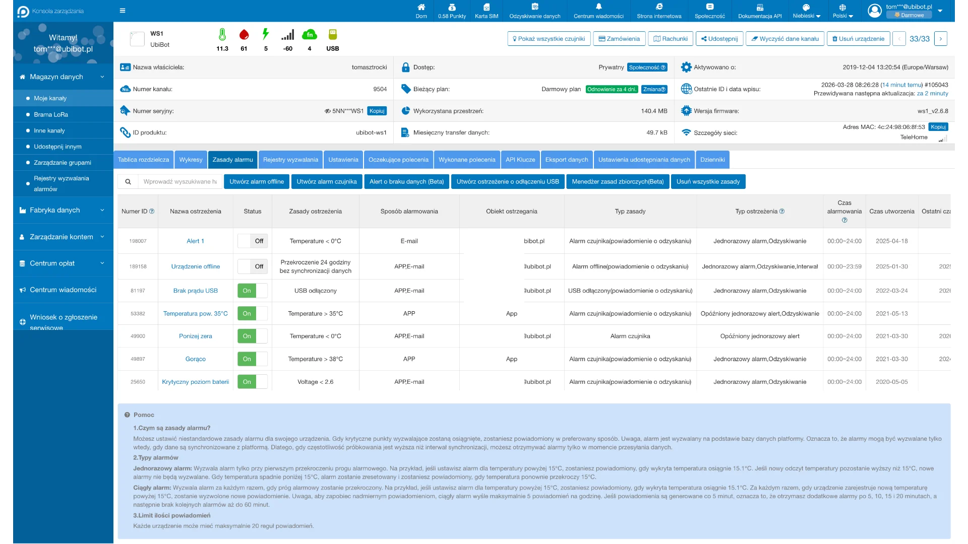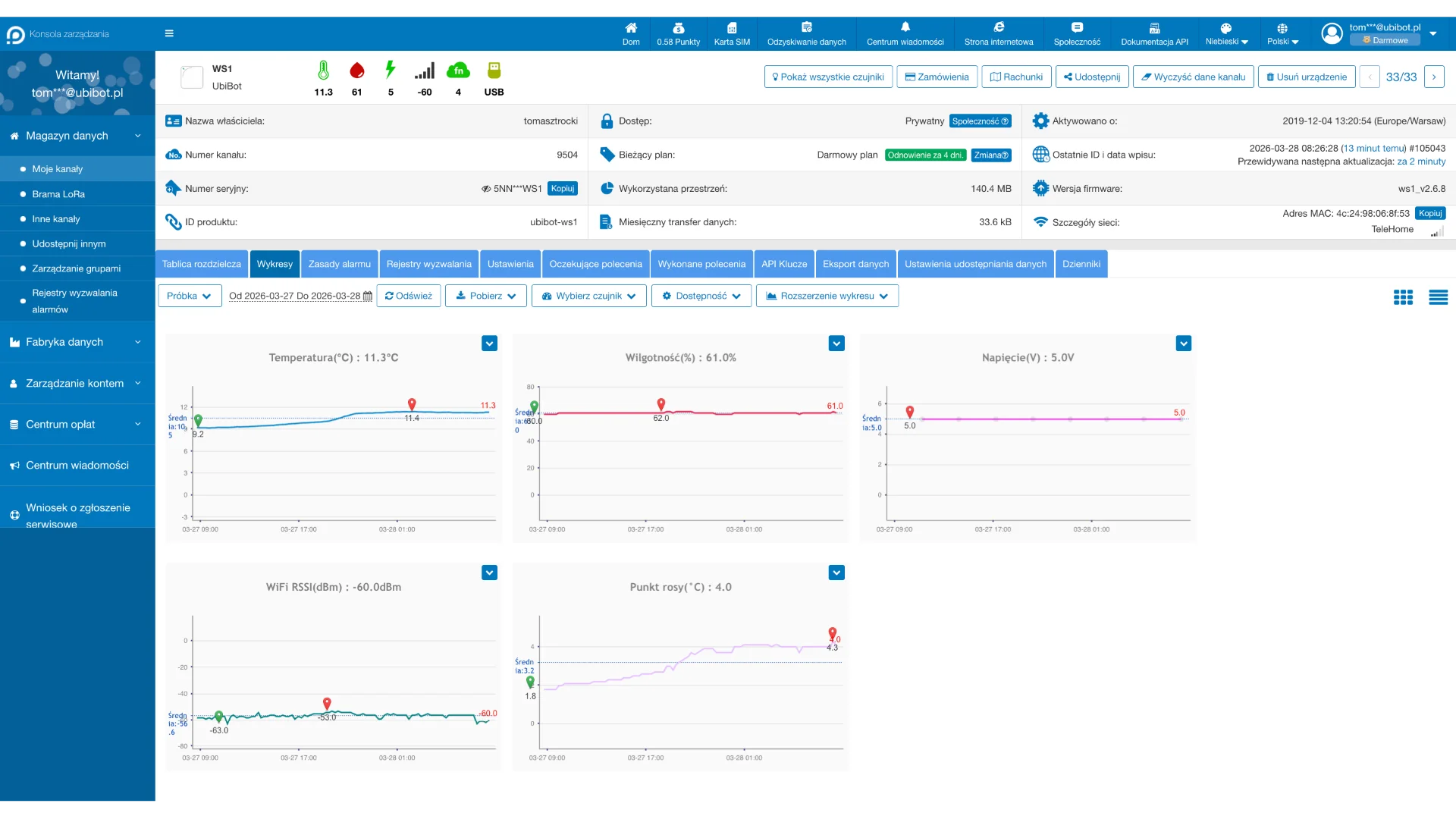 - Urządzenie generuje dane produktowe (odczyty czujników, GPS, timestampy). Zgodnie z Rozporządzeniem (UE) 2023/2854 użytkownik ma prawo bezpłatnego dostępu do tych danych poprzez aplikację UbiBot, panel webowy oraz REST API. Dane można eksportować (CSV) i przekazywać podmiotom trzecim. Szczegóły: https://omnic.pl/data-act-ubibot.